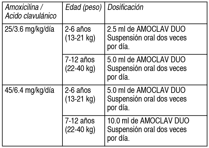 COMPOSICION: Comprimidos recubiertos: cada comprimido recubierto contiene: Amoxicilina (como trihidrato) 875 mg; Acido Clavulánico (como sal potásica) 125 mg. Excipientes c.s. Suspensión extemporánea: cada 5 ml de suspensión extemporánea reconstituida contiene: Amoxicilina (como trihidrato) 400 mg; Acido Clavulánico (como sal potásica) 57 mg. Excipientes c.s. ACCION: Antibiótico de amplio espectro. INDICACIONES: Infecciones por gérmenes sensibles. Amoclav® Dúo está indicado para el tratamiento de infecciones causadas por cepas sensibles de los gérmenes descriptos a continuación para las diferentes patologías: Infecciones del tracto respiratorio inferior: causadas por cepas productoras de betalactamasas de Haemophilus influenzae y Moraxella (Branhamella) catarrhalis. Otitis media: causadas por cepas productoras de betalactamasas de Haemophilus influenzae y Moraxella (Branhamella) catarrhalis. Sinusitis: causadas por cepas productoras de betalactamasas de Haemophilus influenzae y Moraxella (Branhamella) catarrhalis. Infecciones dermatológicas: causadas por cepas productoras de betalactamasas de Staphilococcus aureus, Escherichia coli y Klebsiella spp. Infecciones del tracto urinario: causadas por cepas productoras de betalactamasas de Escherichia coli, Enterobacter spp y Klebsiella spp. A pesar de que Amoclav® Dúo está indicado sólo en las infecciones arriba detalladas, aquellas infecciones causadas por gérmenes susceptibles a la ampicilina son también pasibles de tratamiento con Amoclav® Dúo debido a que éste contiene amoxicilina. Del tal modo, las infecciones causadas por organismos sensibles a la ampicilina y las producidas por gérmenes productores de betalactamasas, pueden ser tratadas con Amoclav® Dúo sin necesidad de un antibiótico adicional. DOSIS: Comprimidos recubiertos: Adultos y niños mayores de 12 años: 1 comprimido de Amoclav® Dúo 1 g 2 veces por día. No se recomienda la administración de Amoclav® Dúo comprimidos en niños menores de 12 años. En caso de insuficiencia renal, con clearence de creatinina entre 10 y 30 ml/min. se recomienda 1 comprimido de 500 mg cada 12 horas, desaconsejándose su empleo con clearence menores a 10 ml/min. En todos los casos se recomienda su administración al inicio de las comidas, no debiéndose superar los 14 días de tratamiento sin efectuar controles. Suspensión extemporánea: la dosis diaria recomendada es: 25/3.6 mg/kg/día en infecciones leves a moderadas (infecciones de vías aéreas superiores, pulmonares leves e infecciones de piel y tejidos blandos); 45/6.4 mg/kg/día en infecciones más severas (otitis media, sinusitis, bronconeumonía, infecciones urinarias). Ver Tabla No existe experiencia suficiente en niños de menos de 2 meses de vida respecto a la dosis de Amoclav® Dúo. En niños con inmadurez de la función renal o con insuficiencia renal (filtrado glomerular inferior a 30 ml/min.) no se recomienda el uso de Amoclav® Dúo. En caso de insuficiencia hepática se recomienda precaución en el uso. Se recomienda su administración al inicio de las comidas, no debiendo extenderse la duración del tratamiento más de 14 días sin efectuar controles. CONTRAINDICACIONES: Hipersensibilidad a la amoxicilina y/o a los antibióticos ß-lactámicos. Mononucleosis infecciosa, infección por Herpes virus, leucemia linfoide. Tratamiento concomitante con allopurinol (mayor posibilidad de reacción alérgica). Se deberá evaluar la relación riesgo-beneficio en pacientes con antecedentes de alergia general (asma, eczema, urticaria), antecedentes de colitis ulcerosa, mononucleosis infecciosa o disfunción renal. PRESENTACIONES: Comprimidos recubiertos: Envase conteniendo 14 comprimidos recubiertos. Suspensión extemporánea: Frasco con polvo para preparar 70 y 140 ml. |