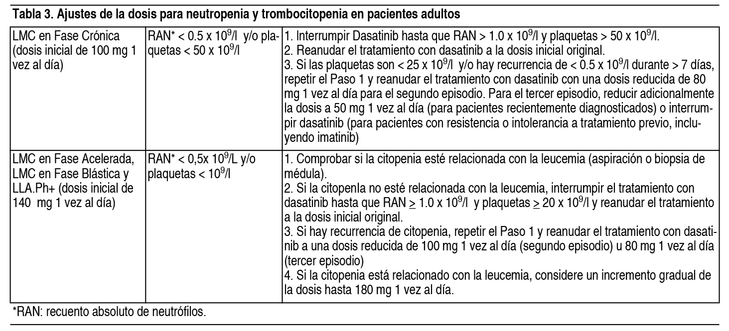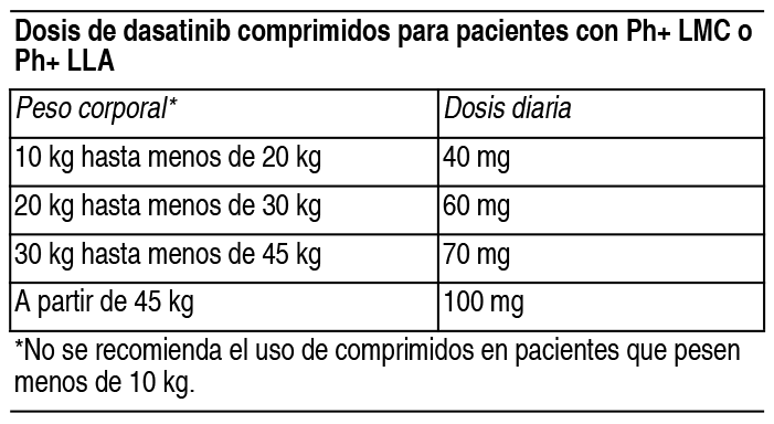 COMPOSICION: Dasanova 20 mg: Cada comprimido recubierto contiene: Dasatinib 20.0 mg, Lactosa Monohidrato 27.0 mg, Celulosa Microcristalina 27.0 mg, Croscarmelosa Sódica 3.2 mg, Hidroxipropilcelulosa 2.4 mg, Estearato de Magnesio 0.4 mg, Alcohol Polivinílico 1.3 mg, Dióxido de Titanio 0.8 mg, Polietilenglicol 0.6 mg, Talco 0.5 mg. Dasanova 50 mg: Cada comprimido recubierto contiene: Dasatinib 50.0 mg, Lactosa Monohidrato 67.5 mg, Celulosa Microcristalina 67.5 mg, Croscarmelosa Sódica 8.0 mg, Hidroxipropilcelulosa 6.0 mg, Estearato de Magnesio 1.0 mg, Alcohol Polivinílico 3.2 mg, Dióxido de Titanio 2.0 mg, Polietilenglicol 1.6 mg, Talco 1.2 mg. Dasanova 70 mg: Cada comprimido recubierto contiene: Dasatinib 70.0 mg, Lactosa Monohidrato 94.5 mg, Celulosa Microcristalina 94.5 mg, Croscarmelosa Sódica 11.2 mg, Hidroxipropilcelulosa 8.4 mg, Estearato de Magnesio 1.4 mg, Alcohol Polivinílico 4.5 mg, Dióxido de Titanio 2.8 mg, Polietilenglicol 2.3 mg, Talco 1.7 mg. Dasanova 100 mg: Cada comprimido recubierto contiene: Dasatinib 100.0 mg, Lactosa Monohidrato 135 mg, Celulosa Microcristalina 135 mg, Croscarmelosa Sódica 16 mg, Hidroxipropilcelulosa 12 mg, Estearato de Magnesio 2.0 mg, Alcohol Polivinílico 6.4 mg, Dióxido de Titanio 4.0 mg, Polietilenglicol 3.2 mg, Talco 2.4 mg. ACCION: Agente Antineoplásico. lnhibidor de la proteína quinasa. Código ATC: L01XE06. INDICACIONES: Dasanova está indicado para el tratamiento de pacientes adultos con: Leucemia mieloide crónica (LMC) con cromosoma Filadelfia positivo (Ph+) en fase crónica recién diagnosticada. LCM en fase crónica, acelerada o blástica, con resistencia o intolerancia al tratamiento previo, incluido imatinib. Leucemia linfoblástica aguda (LLA) con cromosomas Filadelfia positivo (LLA Ph+) y LMC linfoblástica con resistencia o intolerancia a tratamiento previo. Dasanova está indicado para el tratamiento de pacientes pediátricos con: Leucemia mieloide crónica (LMC) con cromosoma Filadelfia positivo (Ph+) en fase crónica recién diagnosticada o leucemia mieloide crónica (LMC) con cromosoma Filadelfia positivo (Ph+) en fase crónica resistente o intolerante a la terapia previa, incluyendo imatinib. Leucemia linfoblástica aguda (LLA) con cromosomas Filadelfia positivo (LLA Ph+) recién diagnosticada en combinación con quimioterapia. DOSIS: El tratamiento debe ser iniciado por un médico especializado en el diagnóstico y tratamiento de los pacientes con leucemia. Pacientes adultos: La dosis inicial recomendada para la leucemia mieloide crónica (LMC) es de 100 mg administrado oralmente 1 vez al día. La dosis inicial recomendada para leucemia mieloide crónica (LMC) en fase acelerada, leucemia mieloide crónica (LMC) en fase mieloblástica o linfoblástica o LLA Ph+ es de 140 mg administrado oralmente 1 vez al día. Población pediátrica (Ph+ LMC - fase crónica y Ph+ - LLA): La dosificación para niños y adolescentes está basada en su peso corporal (ver Tabla 1). Dasatinib se administra 1 vez al día oralmente y la dosis debe ser recalculada cada 3 meses en base a los cambios en el peso corporal o más seguido en el caso de ser necesario. No se recomienda la formulación en comprimidos para pacientes con un peso menor de 10 kg. Los aumentos o reducciones de la dosis se recomiendan con base en las respuestas y la tolerabilidad individual de cada paciente. No hay experiencia en el tratamiento con dasatinib en niños menores de 1 año. La dosis inicial diaria recomendada de dasatinib comprimidos en pacientes pediátricos se muestra en la Tabla 1 a continuación: Ver Tabla Duración del tratamiento: En los estudios clínicos publicados, el tratamiento con dasatinib en adultos con Ph+ LMC en fase crónica, con LMC en fase acelerada o fase mieloblástica o linfoblástica (fase avanzada) o Ph+ LLA y los pacientes pediátricos con Ph+ LMC en fase crónica fue continuado hasta la progresión de la enfermedad o hasta que no pudo ser tolerado por el paciente. El efecto de una suspensión en el tratamiento en el resultado de la enfermedad a largo plazo después de haber alcanzado una respuesta citogenética o molecular (incluyendo respuesta citogenética completa, respuesta molecular mayor y respuesta molecular 4.5) no ha sido investigada. En algunos estudios clínicos publicados, el tratamiento con dasatinib en pacientes pediátricos con Ph+ LLA se administró de modo continuo conjuntamente con bloques sucesivos de quimioterapia de médula ósea, con una duración máxima de 2 años. En los pacientes que recibieron un trasplante subsecuente de células madre, el dasatinib puede ser administrado durante 1 año más postrasplante. Los aumentos o reducciones de dosis se recomiendan con base en la respuesta del paciente y su tolerancia. Incremento gradual de la dosis: En algunos estudios clínicos publicados de pacientes adultos con LMC y LLA Ph+, se permitió el incremento gradual de la dosis a 140 mg 1 vez al día (LMC en fase crónica) o 180 mg 1 vez al día (LMC en fase avanzada y LLA Ph+), en pacientes que no habían alcanzado una respuesta hematológica o citogenética a la dosis inicial recomendada. Los aumentos de dosis que se detallan a continuación en la Tabla 2 se recomiendan en pacientes pediátricos con Ph+ LMC que no alcanzan una respuesta hematológica, citogenética y molecular en los puntos de tiempo recomendados en el tratamiento corriente. Ver Tabla No se recomienda el escalado de dosis en pacientes pediátricos con Ph+ LLA, dado que el dasatinib en estos pacientes es administrado junto con quimioterapia. Ajustes de la dosis para reacciones adversas: Mielosupresión: En algunos estudios clínicos publicados, se controló la mielosupresíón mediante la interrupción o reducción de la dosis o la discontinuación del estudio de la terapia. Las transfusiones de plaquetas y de glóbulos rojos fueron utilizadas como tratamiento apropiado. Se ha usado el factor de crecimiento hematopoyético en pacientes con mielos