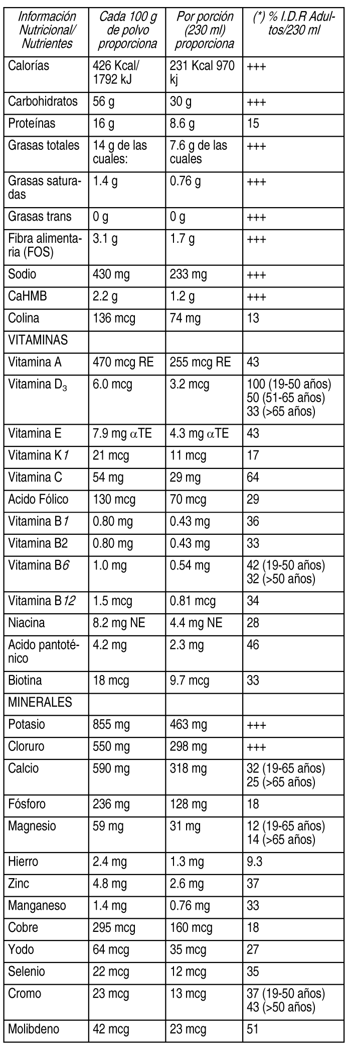 COMPOSICION: Contiene: Maltodextrina, Sacarosa, Aceites Vegetales (Aceite de Girasol de Alto Contenido Oleico, Aceite de Soja, Aceite de Canola), Caseinato de Calcio, Aislado de Proteína de Soja, Minerales (Citrato de Potasio, Citrato de Sodio, Cloruro de Potasio, Cloruro de Magnesio, Fosfato de Sodio, Hidróxido de Potasio, Cloruro de Sodio, Fosfato de Potasio, Sulfato Ferroso, Sulfato de Zinc, Sulfato de Manganeso, Sulfato Cúprico, Cloruro de Cromo, Molibdato de Sodio, Ioduro de Potasio, Selenito de Sodio), Fructoligosacáridos, Beta-hidroxi beta-metilbutirato de Calcio, Vitaminas (Cloruro de Colina, Acido Ascórbico, Palmitato de Ascorbilo, Mezcla de Tocoferoles, Niacinamida, d-Pantotenato de Calcio, dl-Alfa Tocoferil Acetato, Clorhidrato de Piridoxina, Clorhidrato de Tiamina, Rivoflavina, Palmitato de Vitamina A, Betacaroteno, Acido Fólico, d-Biotina, Vitamina K, [Filoquinona], Vitamina D3 [Colecalciferol], Cianocobalamina), Saborizante. Contiene Derivados de Leche y Derivados de Soja. Ver Tabla