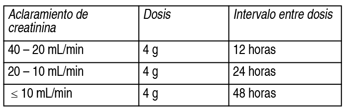 COMPOSICION: Comprimidos 500 mg: Cada comprimido contiene: Fosfomicina (como sal sódica) 500 mg. Comprimidos 1000 mg: Cada comprimido contiene: Fosfomicina (como sal sódica) 1000 mg. Inyectable IM: Cada frasco-ampolla contiene: Fosfomicina Base (como Fosfomicina Disódica estéril) 1 g. Inyectable IV 1 g: Cada frasco-ampolla contiene: Fosfomicina Base (como Fosfomicina Disódica estéril) 1 g. Inyectable IV 4 g: Cada frasco-ampolla contiene: Fosfomicina Base (como Fosfomicina Disódica Estéril) 4 g. Suspensión oral de preparación extemporánea: Cada 100 ml contiene: Fosfomicina Base (como Fosfomicina Calcica) 5 g. ACCION: Antibacteriano. INDICACIONES: Inyectable: Fosfomicina inyectable intravenosa: está indicada en el tratamiento de infecciones complicadas o graves urinarias, dermatológicas, ginecológicas, respiratorias, del aparato locomotor, quirúrgicas, septicemias, endocarditis y meningitis producidas por microorganismos sensibles a la fosfomicina. En casos de infecciones hospitalarias graves (septicemias, endocarditis, meningitis), es imprescindible utilizar la fosfomicina en asociación con otros antibióticos para evitar al máximo la selección de mutantes resistentes. Las asociaciones con penicilinas, cefalosporinas, aminoglucósidos, colistina, vancomicina, son siempre sinérgicas y jamás antagónicas. La fosfomicina se puede utilizar en la meningitis estafilocócica meticilín-resistente en asociación con otros antibióticos. Comprimidos / Suspensión oral: La fosfomicina por vía oral está indicada en el tratamiento de infecciones del tracto urinario no complicadas, infecciones del tracto gastrointestinal e infecciones dermatológicas producidas por microorganismos sensibles a su acción. DOSIS: Suspensión oral: Prematuros y lactantes: 1 - 2 medidas de 2.5 ml cada 8 horas (100-200 mg cada 8 horas). Niños: 1 - 2 medidas de 5 ml cada 8 horas. (250-500 mg cada 8 horas). Niños mayores de 5 años (más de 20 kg): 2 - 4 medidas de 5 ml cada 8 horas (500 - 1000 mg cada 8 horas). Insuficiencia renal: Dentro del rango recomendado, no se precisa modificar la dosis. Técnicas de administración: Para la preparación agregar agua hasta la mitad del envase, tapar y agitar vigorosamente y luego completar con agua hasta el nivel indicado en el frasco. Administrar con el vaso dosificador cada 8 horas. Inyectable: Niños: 200 mg - 400 mg/kg/día, distribuidos en 2-3 administraciones diarias. Adultos: 1.0 g - 4.0 g cada 6-8 horas. Insuficiencia renal: Se mantendrá constante la dosis de 4 g por administración, alargando el intervalo entre las mismas en función del aclaramiento de creatinina. Ver Tabla Pacientes en hemodiálisis: Vía intravenosa: Una perfusión de 2-4 gramos tras cada sesión de hemodiálisis. Técnicas de administración: Inyectable intravenoso 1.0 g: Disolver el contenido del vial con los 10 ml de la ampolla de disolvente. Diluir en agua para inyección o en suero glucosado a razón de 4 ml por cada ml de la solución previamente preparada y poner en goteo de 1 hora de duración. Tomar el volumen correspondiente a la dosis adecuada. Inyectable intravenoso 4.0 g: Disolver el contenido del vial de 4 g con 20 ml de agua para inyección o suero glucosado. Pasar a un envase con 200 ml de agua para inyección o suero glucosado y poner en goteo de 1 hora de duración. Al disolver la fosfomicina se produce una reacción exotérmica, con el consiguiente desprendimiento de calor, lo que hace que el vial se caliente ligeramente. Nota: Fosfomicina intravenosa 4.0 g está destinada preferentemente al tratamiento de infecciones severas en adultos, que requieren dosis de 12 a 16 g por día y adecuada concentración en plasma. Por estas razones es necesario asegurar una perfusión de 500 a 700 mg de fosfomicina por hora, lo cual brinda niveles en plasma de 60 a 100 mcg/ml. En pacientes adultos es aconsejable proceder con la siguiente metodología: Dosis diaria de 12 g: incorporar 4 g de fosfomicina en cada frasco con 500 ml de solución parenteral; perfundir 3 frascos (1500 ml) por día lo cual requiere un goteo aproximadamente de 20 gotas por minuto. Este esquema asegura la perfusión de 500 mg de fosfomicina por hora que brindan un nivel plasmático permanente de 60 mcg/ml. Dosis diaria de 16 g: incorporar 4 g de fosfomicina en cada frasco con 500 ml de solución parenteral, perfundir 4 frascos (2000 ml) por día lo cual requiere un goteo aproximadamente de 30 gotas por minuto. Este esquema asegura la perfusión de 666 mg de fosfomicina por hora, que brindan un nivel plasmático permanente de 100 mcg/ml. PRESENTACIONES: Comprimidos: Envases conteniendo 8, 16, 32, 100 (EH), 250 (EH) y 500 (EH) comprimidos, para ambas concentraciones. Inyectable IM: Envases conteniendo 1, 10 (EH) y 25 (EH) frascos-ampolla de 1 g con o sin ampolla de disolvente de 4 ml. Inyectable IV 1 g: Envases conteniendo 1, 10 (EH) y 25 (EH) frascos-ampolla de 1 g con o sin ampolla de solvente de 10 ml. Inyectable IV 4 g: Envases conteniendo 1, 10 (EH) y 25 (EH) frascos-ampolla de 4 g. Suspensión oral de preparación extemporánea: Envases conteniendo 1 y 24 (EH) frascos con 60 ml y 120 ml. |