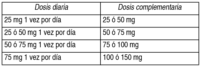COMPOSICION: Cada comprimido birranurado contiene: Pregabalina 75.00 mg. ACCION: Antiepiléptico. Antineurálgico. INDICACIONES: Dolor neuropático asociado a neuropatía diabética periférica. Neuralgia postherpética. Adyuvante en pacientes adultos con convulsiones de inicio parcial. Fibromialgia. Aansiedad generalizada en adultos (según criterios DSM IV). Dolor neuropático post-injuria espinal. DOSIS: Un comprimido birranurado de 75 mg, puede fraccionarse en 3 fragmentos de 25 mg cada uno. La dosis diaria debe administrarse en 2 a 3 tomas diarias. Tratamiento del dolor neuropático asociado con neuropatía periférica diabética: Dosis inicial: 75 mg 2 veces al día ó 50 mg 3 veces al día. En función de la respuesta y tolerancia del paciente, la dosis podrá incrementarse, dentro de la primera semana, a 150 mg 2 veces al día ó 100 mg 3 veces al día. Dosis máxima recomendada: 300 mg/día. Tratamiento de la neuralgia postherpética: Dosis inicial: 75 mg 2 veces al día ó 50 mg 3 veces al día. En función de la respuesta y tolerancia del paciente, la dosis podrá incrementarse, dentro de la primera semana, hasta un máximo de 300 mg/día. La dosis recomendada es de 75-150 mg 2 veces al día ó 50-100 mg 3 veces al día (150 a 300 mg/día). En pacientes tratados con 300 mg/día que no experimenten un alivio suficiente del dolor luego de 2-4 semanas de tratamiento, la dosis podrá incrementarse a 600 mg/día (300 mg 2 veces al día ó 200 mg 3 veces al día). Dosis superiores a 300 mg/día deben reservarse para pacientes que presenten dolor persistente y una buena tolerancia a la dosis de 300 mg/día. Tratamiento adyuvante en pacientes adultos con convulsiones de inicio parcial: El rango de dosis recomendado es de 150 a 600 mg/día, en 2 ó 3 tomas diarias. Dosis inicial: 75 mg 2 veces al día ó 50 mg 3 veces al día. En función de la respuesta y tolerancia del paciente, la dosis podrá incrementarse, a intervalos semanales, a 300 mg/día y posteriormente a 600 mg/día. Dosis máxima recomendada: 600 mg/día. Tratamiento de la fibromialgia: El rango de dosis recomendado es de 300 a 450 mg/día, en 2 ó 3 tomas diarias. Dosis inicial: 75 mg 2 veces al día. En función de la respuesta y tolerancia del paciente, la dosis podrá incrementarse, a intervalos semanales, a 300 mg/día, y posteriormente a 450 mg/día. Dosis máxima recomendada: 450 mg/día. Tratamiento de la ansiedad generalizada en adultos: Dosis inicial: 75 mg 2 veces al día ó 50 mg 3 veces al día. En función de la respuesta y tolerancia del paciente, la dosis podrá incrementarse, a intervalos semanales, a 300 mg/día, seguidamente a 450 mg/día y posteriormente a 600 mg/día, en 2 ó 3 tomas diarias. La necesidad de continuar con el tratamiento deberá reevaluarse periódicamente. Dosis máxima recomendada: 600 mg/día. Tratamiento del dolor neuropático post-injuria espinal: Dosis inicial: 75 mg 2 veces al día ó 50 mg 3 veces al día. En función de la respuesta y tolerabilidad del paciente, la dosis podrá incrementarse, dentro de la primera semana, a 150 mg 2 veces al día ó 100 mg 3 veces al día. En pacientes tratados con 300 mg/día que no experimenten un alivio suficiente del dolor luego de 2-3 semanas de tratamiento, la dosis podrá incrementarse a 600 mg/día (300 mg 2 veces al día o 200 mg 3 veces al día). Situaciones clínicas particulares: Insuficiencia renal: la siguiente tabla presenta las dosis sugeridas en pacientes con alteración de la función renal. Ver Tabla El clearance de creatinina puede ser estimado usando la ecuación de Cockcroft y Gault: Ver Tabla Dosis complementaria luego de la hemodiálisis: Además de la dosis diaria de pregabalina, luego de cada sesión de 4 horas de hemodiálisis debe administrarse una dosis complementaria de inmediato: Ver Tabla Insuficiencia hepática: no se requiere un ajuste de dosis. Pacientes pediátricos: la seguridad y la eficacia de pregabalina en niños menores de 12 años y adolescentes (12-17 años) no han sido establecidas. Pacientes geriátricos: dado que los pacientes ancianos son más propensos a desarrollar insuficiencia renal, se recomienda precaución durante la selección de la dosis y un ajuste de la misma en función del clearance de creatinina. Modo de administración: El producto puede administrarse con o fuera de las comidas. PRESENTACIONES: Envase conteniendo 30 comprimidos birranurados. |