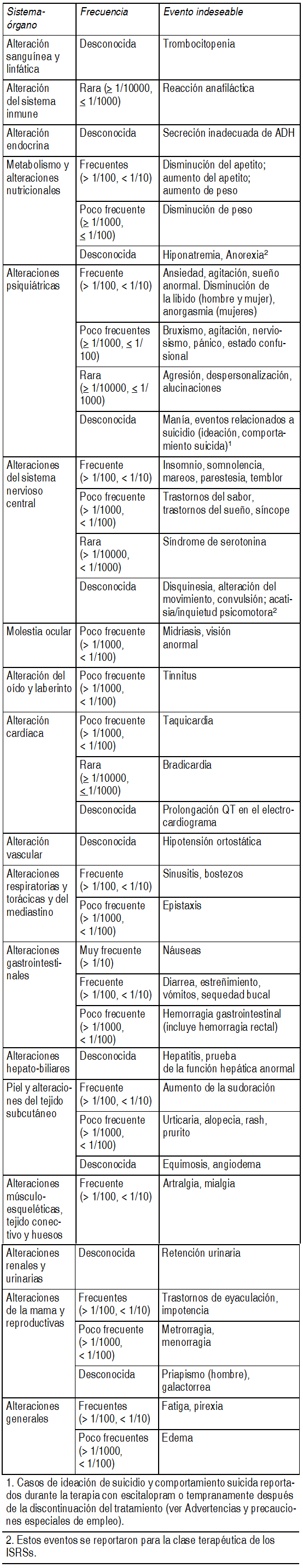 EFECTOS: Las reacciones adversas son más frecuentes durante la primera o segunda semana del tratamiento y habitualmente disminuyen en intensidad y frecuencia con la continuación del tratamiento. Las reacciones adversas conocidas de los ISRSs y también comunicadas para escitalopram en estudios clínicos controlados con placebo o como reacciones espontáneas post-comercialización se enumeran más abajo por sistemas orgánicos y frecuencia. Las frecuencias específicas no están corregidas respecto del placebo. Las frecuencias se definen como: muy frecuente (≥ 1/10), frecuente (≥ 1/100, < 1/10), poco frecuente (≥ 1/1000, ≤ 1/100), rara (≥ 1/10000, ≤ 1/1000), muy rara (≤ 1/10000) o desconocida (no puede estimarse a partir de los datos disponibles). Ver Tabla Se han registrado casos de prolongación del QT durante el período de post-comercialización, predominantemente en pacientes con enfermedad cardíaca previa. En un estudio doble ciego, controlado con placebo en sujetos sanos, el cambio sobre la línea de base en el QT (corrección de Fridericia) fue de 4.3 mseg con la dosis de 10 mg/día y de 10.7 mseg con una dosis de 30 mg/día. Estudios epidemiológicos, principalmente realizados en pacientes mayores de 50 años que estaban recibiendo ISRSs y ATCs mostraron un incremento de fractura ósea. El mecanismo relacionado a este evento es desconocido.