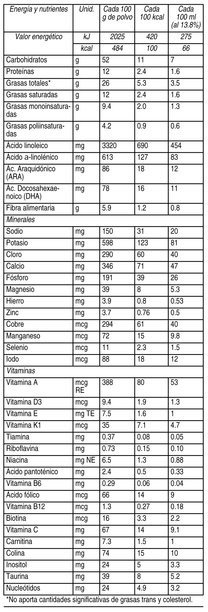 COMPOSICION: Ver Tabla Contiene: Concentrado Hidrolizado de Proteínas de Suero, Maltodextrina, Aceites Vegetales (Aceites de: Palma, Canola, Coco, Girasol), Aceite de Células Simples (ARA), Fibra Alimentaria (Galacto-Oligosacáridos, Fructo-Oligosacáridos), Mono y Diglicéridos Esterificados con Acido Cítrico, Fosfato Tricálcico, Aceite de Pescado, Cloruro de Potasio, Citrato Trisódico, Cloruro de Magnesio, Carbonato de Calcio, Cloruro de Colina, Acido L-Ascórbico, Taurina, L-Ascorbato de Sodio, Sulfato Ferroso, Inositol, Sulfato de Zinc, Nucleótidos (Uridina, Citidina, Adenosina, Inosina, Guanosina), Acetato de DL Alfa Tocoferol, L-Carnitina, Nicotinamida, D-Pantotenato de Calcio, Biotina, Sulfato Cúprico, Acido Fólico, Palmitato de Retinol, DL-Alfa Tocoferol, Cianocobalamina, Hidroclorhidrato de Tiamina, Riboflavina, Colecalciferol, Hidroclorhidrato de Piridoxina, Sulfato de Manganeso, Ioduro de Potasio, Fitomenadiona, Selenito de Sodio. Contiene derivados de Leche y Pescado. DESCRIPCIONES: Alimento para propósitos médicos específicos con proteínas de suero parcialmente hidrolizadas, con ácidos grasos poliinsaturados de cadena larga, para lactantes. Libre de gluten. ACCION: La fórmula para el tratamiento de la alergia a la proteína de leche de vaca. Fórmula láctea para propósitos médicos específicos, tratamiento APLV leve. INDICACIONES: Para el tratamiento de la alergia a la proteína de la leche de vaca con síntomas leves o moderados, excluyendo los gastrointestinales en lactantes desde el nacimiento. DOSIS: Dilución: 13.8%. Medida al ras: 4.5 g. PRESENTACIONES: Lata herméticamente sellada conteniendo 400 g de polvo, con sistema easy-open y tapa plástica de seguridad. |