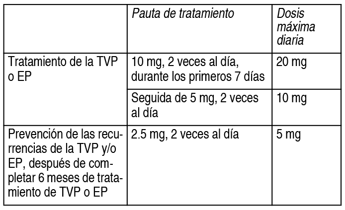 DOSIS: Adultos: Prevención del TEV en cirugía electiva de reemplazo de cadera o rodilla: La dosis recomendada de apixabán es de 2.5 mg, por vía oral, administrados 2 veces al día. La dosis inicial se debe tomar de 12 a 24 horas después de la cirugía. El médico debe evaluar los potenciales beneficios de una anticoagulación precoz, así como también, los riesgos de sangrado posquirúrgico, al decidir el momento de la administración de apixabán dentro de este lapso. En pacientes sometidos a una cirugía de reemplazo de cadera: La duración recomendada del tratamiento es de 32 a 38 días. En pacientes sometidos a una cirugía de reemplazo de rodilla: La duración recomendada de tratamiento es de 10 a 14 días. Prevención del ACV y de la embolia sistémica en pacientes con fibrilación auricular no valvular: La dosis recomendada de apixabán es de 5 mg, por vía oral, administrados 2 veces al día. Reducción de dosis: La dosis recomendada de apixabán es de 2.5 mg, administrados 2 veces al día, para pacientes con fibrilación auricular no valvular y al menos 2 de las siguientes características: Edad ≥80 años, peso corporal igual o menor a 60 kg o creatinina sérica igual o mayor a 1.5 mg/dl (133 micromoles/l). La duración del tratamiento es de largo plazo. Tratamiento de la TVP, tratamiento de la EP y prevención de las recurrencias de la TVP y de la EP: La dosis recomendada de apixabán para el tratamiento de la TVP aguda y de la EP, es de 10 mg, por vía oral, administrados 2 veces al día, durante los primeros 7 días, seguida de 5 mg, 2 veces al día. Según las guías médicas disponibles, la duración corta del tratamiento (como mínimo de 3 meses) debe basarse en factores de riesgo transitorios (por ejemplo, cirugía reciente, traumatismo, inmovilización). La dosis recomendada de apixabán para la prevención de las recurrencias de TVP y de la EP es de 2.5 mg, por vía oral, administrados 2 veces al día. Cuando esté indicada la prevención de las recurrencias de la TVP y de la EP, se debe iniciar con 2.5 mg, 2 veces al día, después de completar 6 meses de tratamiento con apixabán 5 mg, 2 veces al día o con otro anticoagulante, tal como se indica en la tabla a continuación: Ver Tabla La duración del tratamiento se debe individualizar en cada caso, luego de evaluar el beneficio del tratamiento frente al riesgo de hemorragia. Forma de Administración: Vía oral. Los comprimidos de Pixaban se deben tragar con agua, con o sin los alimentos. Es posible triturar los comprimidos y disolverlos con agua o glucosa al 6 %, o jugo de manzana, o mezclarlo con alimentos blandos (como puré de manzana), y administrarlos inmediatamente en aquellos pacientes con dificultad al tragar. El comprimido de Pixaban puede ser triturado y disuelto en 60 ml de agua o glucosa al 6 % y administrarse inmediatamente por sonda nasogástrica. Olvido de dosis: En caso de olvido en la toma de una dosis, el paciente debe tomar inmediatamente la dosis olvidada y luego continuar con la dosis siguiente a la hora programada. La dosis no se debe duplicar para compensar una dosis olvidada. Cambio de tratamiento: Se puede realizar cambio de tratamiento de anticoagulantes parenterales a apixabán y viceversa, en la próxima dosis programada. Estos medicamentos no deben ser administrados simultáneamente. Cambio de tratamiento de antagonistas de la vitamina K a Pixaban: Cuando se cambie de tratamiento de un antagonista de la vitamina K a Pixaban, se debe discontinuar el tratamiento con warfarina u otro tratamiento con antagonistas de la vitamina K e iniciar el tratamiento con Pixaban cuando el RIN (Rango Internacional Normalizado) sea menor a 2. Cambio de tratamiento de Pixaban a antagonistas de la vitamina K: Cuando se cambie de tratamiento de Pixaban a un antagonista de la vitamina K, continuar con la administración de Pixaban durante al menos 2 días después de comenzar el tratamiento con el antagonista de la vitamina K. Después de 2 días de coadministración de Pixaban con el antagonista de la vitamina K, se debe realizar una medición del RIN antes de la próxima dosis programada de Pixaban. Continuar con la coadministración de Pixaban y el antagonista de la vitamina K hasta que el RIN sea igual o mayor a 2. Información adicional: Pacientes con disfunción hepática: Pixaban está contraindicado en los pacientes con enfermedad hepática asociada a coagulopatía y riesgo de sangrado relevante. No se recomienda el uso en pacientes con insuficiencia hepática grave. Administrar con precaución en pacientes con insuficiencia hepática leve a moderada (Child-Pugh A o B); no se necesitan ajustes de la dosis en estos pacientes. Utilizar con precaución en pacientes que muestren valores x2 o mayor los valores normales de las enzimas hepáticas (alanino aminotransferasa ALT/aspartato transaminasa AST), o valor de la bilirrubina total igual o mayor a 1.5 del normal. Se debe evaluar la función hepática antes de comenzar el tratamiento con Pixaban. Pacientes con disfunción renal: En pacientes con insuficiencia renal leve o moderada, se deben tener en cuenta las siguientes consideraciones: para la prevención del TEV en cirugía electiva de cadera o rodilla (únicamente para 2.5 mg). Para el tratamiento de la TVP, tratamiento de EP y prevención de las recurrencias de la TVP y de la EP, no es necesario el ajuste de la dosis. Para la prevención del ACV y la embolia sistémica, en pacientes con fibrilación auricular no valvular y creatinina sérica igual o mayor a 1.5 mg/dl (133 micromoles/l), asociada a edad igual o mayor de 80 años, o peso corporal igual o menor de 60 kg, es necesario reducir la dosis como se describe más arriba. En ausencia de otros criterios de reducción de dosis (edad, peso corporal), no es necesario un ajuste de dosis. En pacientes con insuficiencia renal grave (clearance de creatinina de 15-29 ml/min), aplican las siguientes recomendaciones: para la prevención del TEV en ci