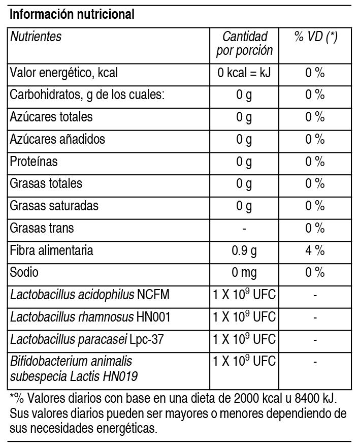 COMPOSICION: Contiene: Polidextrosa, Lactobacillus acidophilus NCFM, Lactobacillus rhamnosus HN001, Lactobacillus paracasei Lpc-37, Bifidobacterium animalis subsp. lactis HN019. Ver Tabla DOSIS: Instrucciones de uso: Disolver el contenido del sobre en 1 vaso de agua (100 ml) agitando vigorosamente. Una vez preparado, consumir inmediatamente. Ingesta diaria: 1 a 2 sobres. CONSERVACION: Mantener el envase en un lugar limpio, seco, fresco y alejado de sustancias tóxicas. Una vez abierto el sobre, debe usarse inmediatamente. Si no, debe ser desechado. No congele el producto. Evite el calor excesivo. Cuide el medio ambiente, deseche este envase en la basura. Los sobres no están etiquetados para su venta individual. OBSERVACIONES: Consulte a su médico. No utilizar en caso de embarazo, mujeres en período de lactancia, ni en niños. Consumir este producto de acuerdo a las recomendaciones de ingesta diaria establecidas en el rótulo. El consumo de suplementos dietarios no reemplaza una dieta variada y equilibrada. Mantener fuera del alcance de los niños. PRESENTACIONES: Envase conteniendo 15 sobres. |