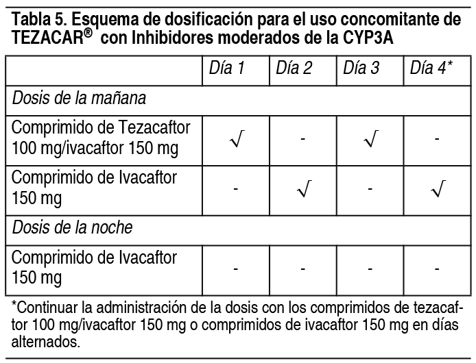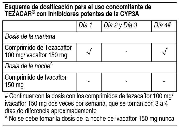 COMPOSICION: Cada comprimido recubierto amarillo de contiene: Ivacaftor 150 mg; Tezacaftor 100 mg. Excipientes: Lauril Sulfato de Sodio, Hidroxipropilmetilcelulosa Acetato Succinato, Hidroxipropilmetilcelulosa E15, Croscaramelosa Sódica, Silica Coloidal Anhidra, Celulosa Microcristalina PH 102, Estearato de Magnesio Vegetal, Aquarius Prime BAT 218006 1), Óxido de Hierro Amarillo, Opadry FX Silver 62W28547 2) c.s. 1) Compuesto por: Dióxido de Titanio, Triacetina, Hidroxipropilmetilcelulosa. 2) Compuesto por: Pigmento Perlado con Base de Mica, Maltodextrina, Carboximetilcelulosa Sódica, Lecitina, Dextrosa Monohidrato. Cada comprimido recubierto celeste contiene: Ivacaftor 150 mg. Excipientes: Laurilsufato de Sodio, Hidroxipropilmetilcelulosa Acetato Succinato, Croscaramelosa Sódica, Celulosa Microcristalina PH101, Polivinilpirrolidona Celulosa Microcristalina PH102, Estearato de Magnesio Vegetal, Opadry II 85F28751 White 1), Indigotina Laca Alumínica, Opadry FX Silver 62W28547 2) c.s. 1) Compuesto por: Alcohol Polivinílico, Dióxido de Titanio, Polietilenglicol, Talco. 2) Compuesto por: Carboximetilcelulosa Sódica, Maltodextrina, Dextrosa Monohidrato, Pigmento Perlado con Base de Mica, Lecitina. ACCION: Modulador de CFTR (regulador de la conductancia transmembrana de la fibrosis quística). Código ATC: R07AX31. INDICACIONES: Tezacar® es una combinación de tezacaftor e ivacaftor, indicado para el tratamiento de pacientes con fibrosis quística (FQ) a partir de los de 6 años de edad y con un peso mayor o igual a 30 kg que son homocigotas para la mutación F508 de lo que presentan al menos una mutación en el gen regulador de la conductancia transmembrana de la fibrosis quística (CFTR) que presenta respuesta al tratamiento con tezacaftor/ivacaftor en base a los datos in vitroy/o la evidencia clínica (ver Propiedades farmacológicas). En caso de desconocerse el genotipo de un paciente, debe efectuarse un análisis de mutaciones del gen de la FQ para detectar la presencia de una mutación en el CFTR y, posteriormente, debe verificarse el esultado con una secuenciación bidireccional según lo recomienden las instrucciones de uso correspondientes al análisis de mutaciones. DOSIS: Información de dosificación en adultos, adolescentes y niños a partir de los de 6 años de edad y con un peso ≥ 30 kg: La dosis recomendada es 1 comprimido (tezacaftor 100 mg/ivacaftor 150 mg) tomado por la mañana y 1 comprimido (ivacaftor 150 mg) tomado por la noche, separados por aproximadamente 12 horas. Tezacar® es para uso oral. Dosis omitidas: Si pasaron 6 horas o menos desde la dosis de la mañana o de la noche que se olvidó tomar, el paciente debe tomar la dosis olvidada tan pronto como sea posible y continuar con el régimen original. Si pasaron más de 6 horas desde la dosis olvidada de la mañana o de la noche, el paciente no debe tomar la dosis olvidada. La siguiente dosis del régimen puede tomarse al horario usual. No debe tomarse más de 1 dosis al mismo tiempo. Posología en poblaciones especiales: Ajuste de la dosis para los pacientes con insuficiencia hepática: Para el ajuste de la dosis para pacientes con insuficiencia hepática,consulte la Tabla 4. No se han realizado estudios en pacientes con insuficiencia hepática severa (Child-Pugh Clase C), pero se espera que la exposición de tezacaftor e ivacaftor sea mayor que en los pacientes con insuficiencia hepática moderada. Por lo tanto, Tezacar® debe usarse con precaución con una dosis ajustada después de evaluar los riesgos y beneficios del tratamiento en estos pacientes (ver Posología y administración, Uso en poblaciones especiales, Propiedades farmacológicas). Ver Tabla Ajuste de la dosis para pacientes que toman fármacos que son inhibidores de la CYP3A: El régimen de dosificación de Tezacar® debería ser ajustado cuando es coadministrado con inhibidores moderados y potentes de la CYP3A. Cuando se coadministra con inhibidores moderados de la CYP3A (por ejemplo, fluconazol, eritromicina), el régimen de dosificación debería ser ajustado como se indica en la Tabla 5 (ver Interacciones con otros Fármacos, Propiedades farmacológicas). Cuando se coadministra con inhibidores potentes de la CYP3A (por ejemplo, ketoconazol, itraconazol, posaconazol, voriconazol, telitromicina y claritromicina), el régimen de dosificación debería ser ajustado como en la Tabla 5 (ver Interacciones con otros fármacos, Propiedades farmacológicas). Ver Tabla Ver Tabla Deberían evitarse alimentos o bebidas que contengan pomelo o naranjas amargas durante el tratamiento con Tezacar® (ver Inteacciones con otros fármacos). Modo de administración: Tezacar® es para uso oral. Indicar a los pacientes que traguen los comprimidos enteros. Tezacar® debería tomarse con alimentos con contenido graso, tales como los alimentos recomendados en las guías nutricionales estándar para la enfermedad. Ejemplos de alimentos que contienen grasa son aquellos preparados con manteca o aceites o aquellos que contienen huevos, quesos, nueces, leche entera, o carnes. CONTRAINDICACIONES: Hipersensibilidad a algunos de los principios activos o algunos de los excipientes. ADVERTENCIAS: Advertencias y precauciones especiales de empleo: Elevaciones de las transaminasas (AST/ALT): Se han observado aumento de transaminasas en pacientes con FQ tratados con tezacaftor/ivacaftor, así como también con monoterapia con ivacaftor. Se recomienda realizar evaluaciones de las transaminasas (ALT y AST) en todos los pacientes antes de comenzar con la administración de Tezacar®, cada 3 meses durante el primer año de tratamiento y luego anualmente. Para los pacientes con antecedentes de elevaciones de las transaminasas debería considerarse un monitoreo más frecuente. En el caso de elevaciones significativas de las transaminasas, por ejemplo, pacientes con valores de ALT o AST >5 del límite superior del rango normal (LSN),o valores de ALT o AST >3 del LSN con valores de 
